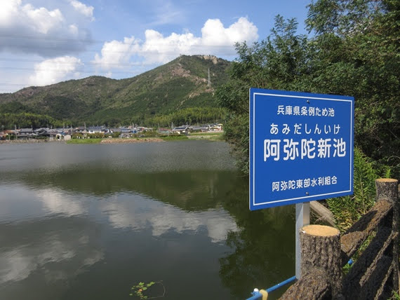 阿弥陀新池に影を映す高御位山、小高御位山稜線